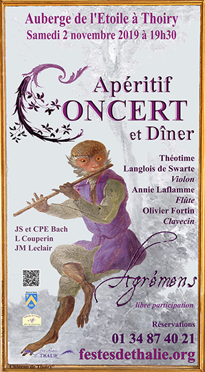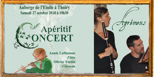 Auberge de l'Etoile 38, rue de la Porte Saint Martin - ,THOIRYA l'occasion de leur petit stage d'automne, Annie Laflamme (flûte traversière baroque) et Olivier Fortin (clavecin) se produiront samedi 28 octobre 2017 à 19h30 à l'Auberge de l'Etoile à Thoiry lors d'un apéritif-concert. Au programme des oeuvres de Johann Sebastian Bach, François Couperin, Georg Philipp Telemann et Antonio Vivaldi ; L'apéritif sera offert par la […]