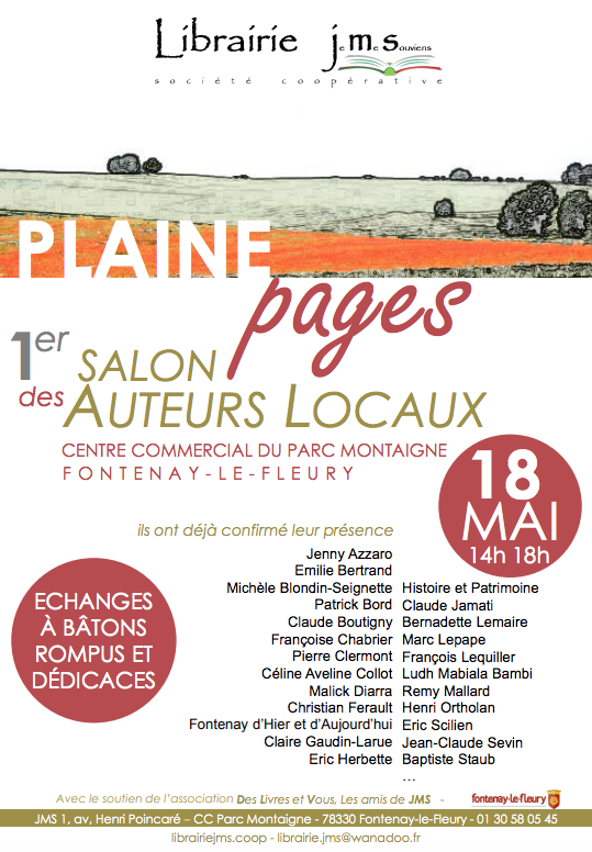 Centre Commercial du Parc Montaigne JMS 1, av, Henri Poincaré,Fontenay-le-FleuryLa librairie JMS organise le 1er salon Plaine Pages, des auteurs locaux autour de la plaine de Versailles. Vous trouverez ci-joint l'affiche de l'évènement. Il y aura plus d'une vingtaine d'auteurs présents. Vous en trouverez les noms sur l'affiche. Romans, essais, jeunesse, histoire,...Plusieurs thèmes seront représentés lors de cette première édition. Ils ont déjà […]