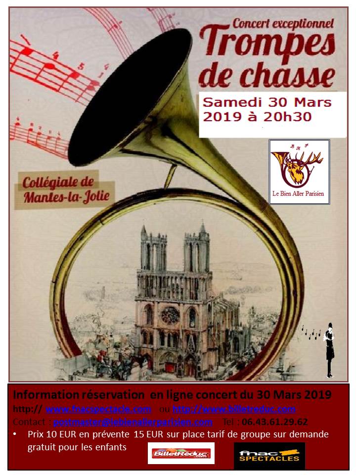 Collégiale Notre-Dame Mantes-la-JolieÀ l’occasion du salon de chasse qui se tiendra à Mantes-la-Jolie du 29 au 31 Mars 2019 , un concert de cet instrument séculaire sera donné le samedi 30 Mars à 20 h 30 en la Collégiale de Mantes la Jolie. Le Bien Aller Parisien, une association œuvrant pour le rayonnement de la trompe de […]