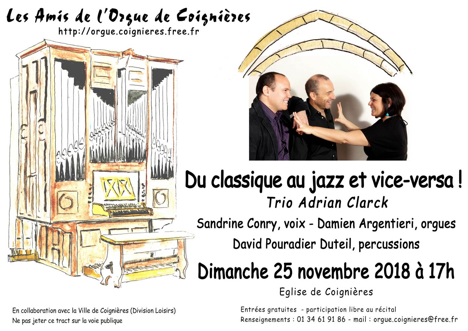 Eglise de Coignières 3 place de la Mairie,CoignièresUn formidable défi, qu'a relevé le Trio Adrian Clarck, d'associer dans un même récital jazz, gospel, blues, chants traditionnels et musique classique. Damien Argentieri, claviers et orgue à tuyaux Sandrine Conry, chant David Pouradier Duteil, percussions
