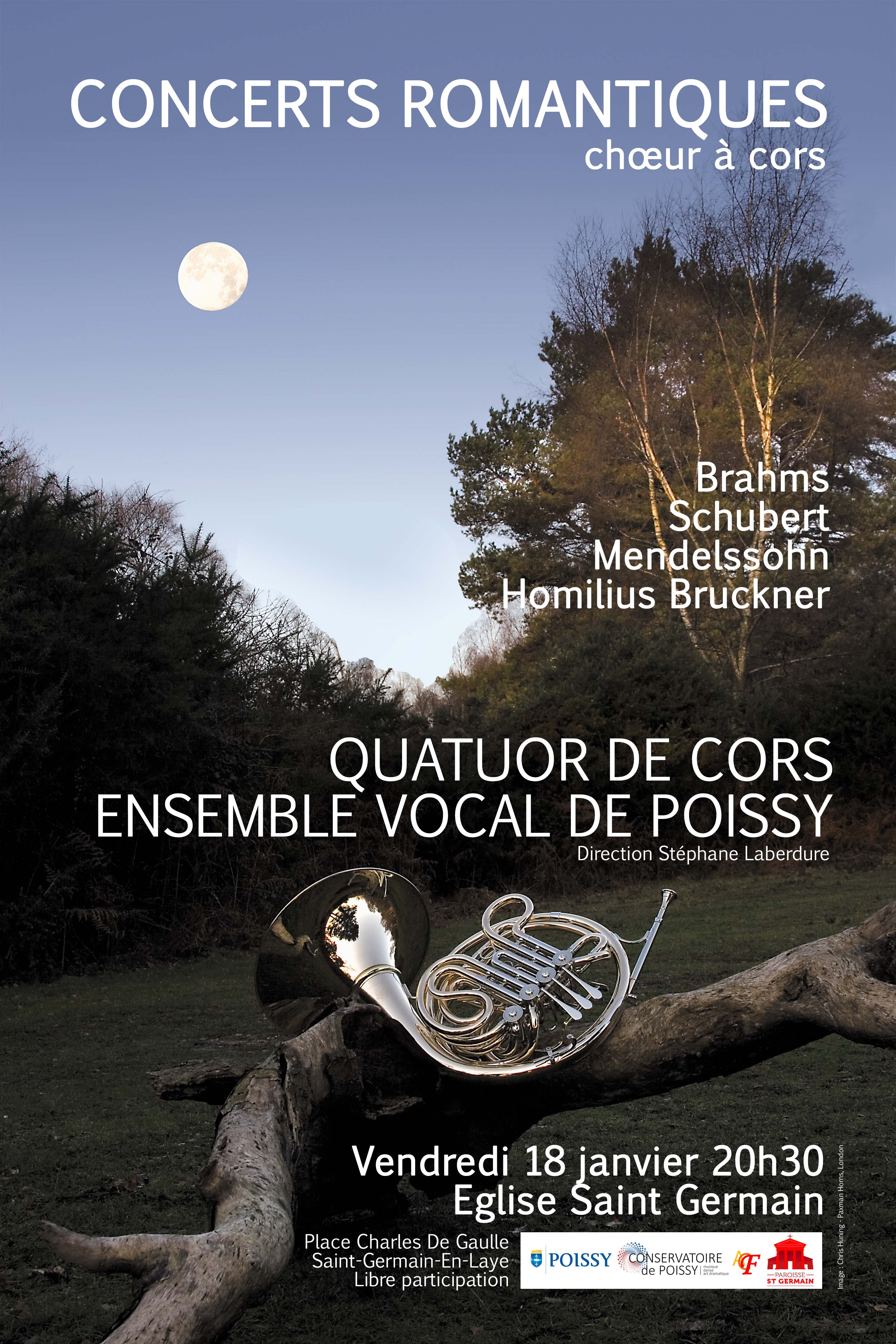 Eglise Saint-Germain Place Charles De Gaulle,Saint-Germain-en-LayeTrès beau concert de musique romantique, découverte d'un répertoire original : oeuvres majestueuses pour choeur (sopranes, alti, ténor, basses) et quatuor de cor (4 voix distinctes), agrémentés de quelques pièces a capella inspirées et d'oeuvres plaisantes pour quatuor de cors !