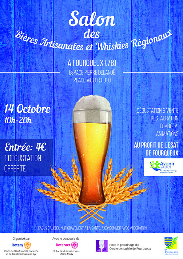 Espace Pierre Delanoë 2 Place Victor Hugo,FOURQUEUXPremier salon du genre dans l'ouest parisien, avec la collaboration de plusieurs Rotary clubs et de l'association foulqueusienne "Club Oenophile de Fourqueux". Les fonds sont reversés à l'ESAT de Fourqueux qui vient de faire l'acquisition d'un foodtruck pour la vente de crêpes.