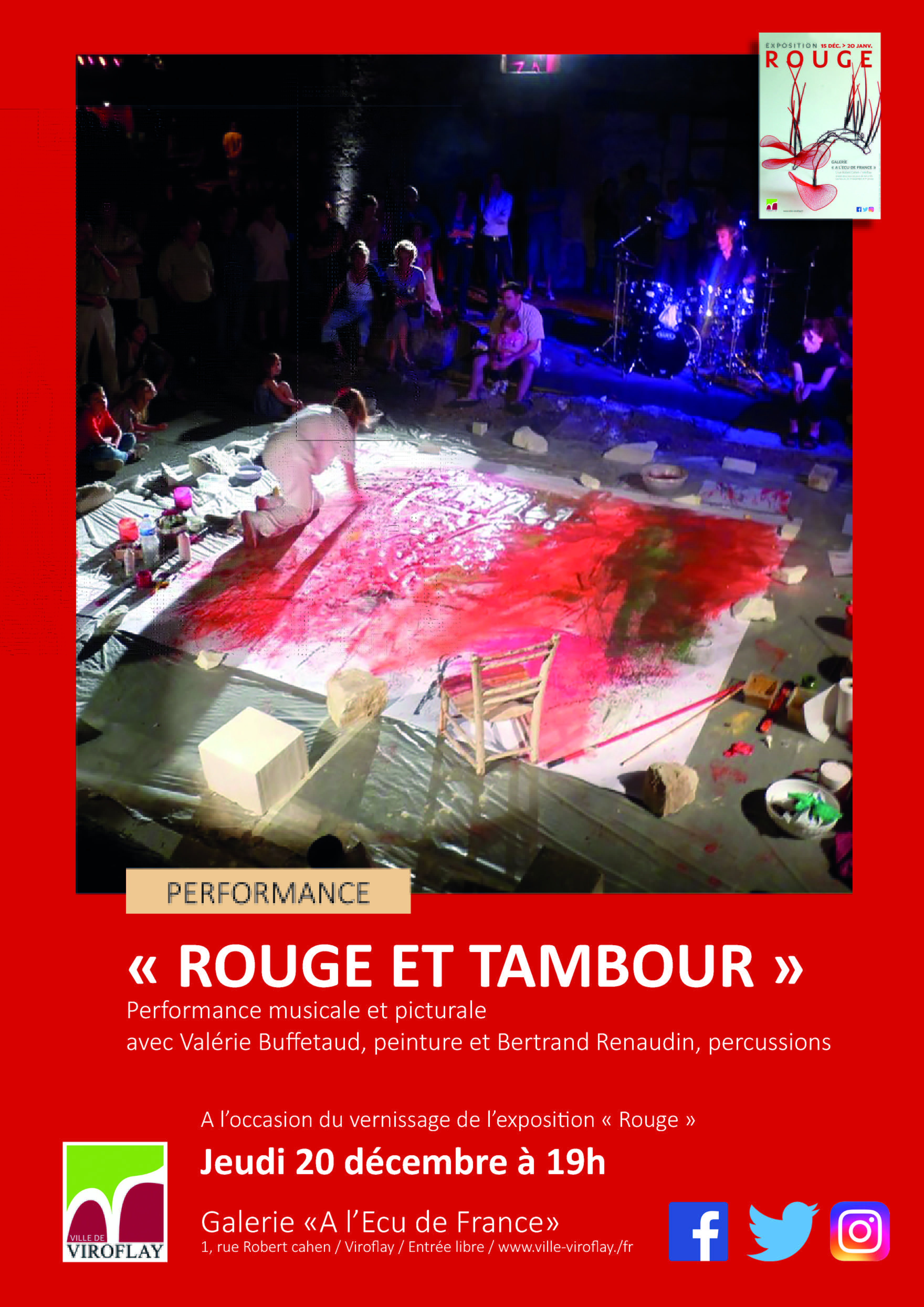 GALERIE A L'ECU DE FRANCE 1, rue robert Cahen,ViroflayPerformance poétique et éphémère « Rouge et tambour » Valérie Buffetaud et Bertrand Renaudin C’est une performance musicale et picturale d’une grande poésie que vont effectuer la peintre Valérie Buffetaud et le batteur de jazz Bertrand Renaudin lors du vernissage de l’exposition « Rouge ». Valérie Buffetaud va réaliser « un live painting », une œuvre picturale en direct sur papier, […]
