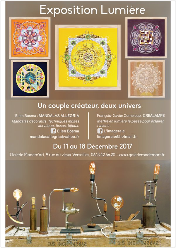 Galerie Modern'art 9 rue du vieux Versailles,VERSAILLESNous sommes un couple de créateur et nous souhaitons partager nos univers lors de notre Exposition Lumière qui se tiendra à la galerie Modern'art de Versailles. Vous découvrirez les créations artistiques de Ellen Bosma, réalisations de mandalas décoratifs, sur toiles ou sur bois, une technique mixte acrylique, tissus, bijoux et toutes autres matières donnant de […]