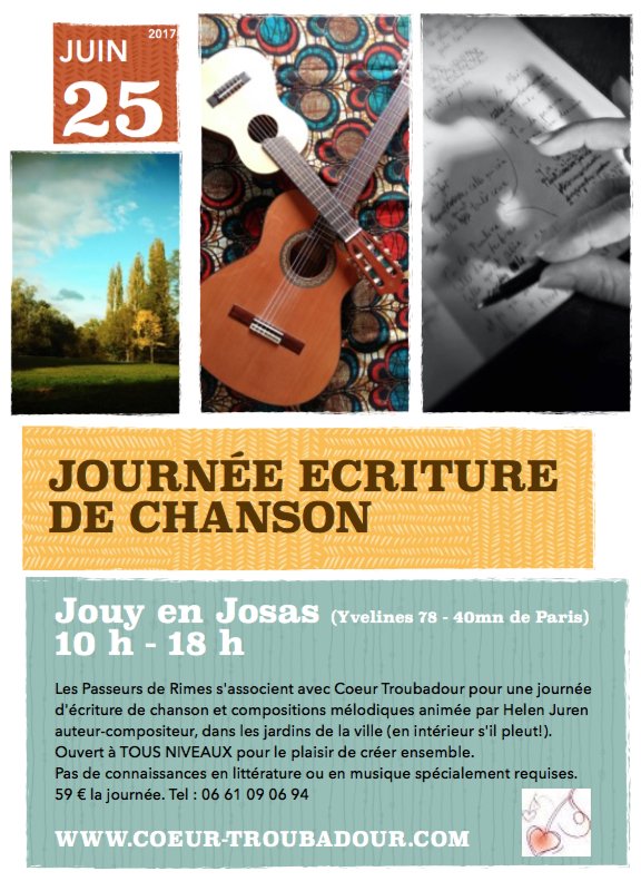 Jouy en JosasLes Passeurs de Rimes s'associent avec Coeur Troubadour pour une journée d'écriture de chanson à Jouy en Josas animée par Helen Juren auteur-compositeur le dimanche 25 juin 2017 de 10h à 18h dans les jardins de la ville (en intérieur s'il pleut!). Ouvert à tous niveaux pour le plaisir de créer ensemble. Pas de connaissances […]