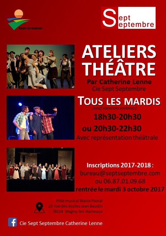 Magny-les-Hameaux 6 rue Haroun Tazieff,Magny-les-HameauxAteliers théâtre à partir de 16 ans tous les mardis (18h30-20h30 ou 20h30-22h30, sauf vacances scolaires) avec Catherine Lenne Cie Sept Septembre au Pôle musical Blaise Pascal à Magny-les-Hameaux (Yvelines). Rentrée le mardi 3 octobre 2017. Représentation théâtrale en fin d'année. Exercices ludiques de théâtre, respiration, technique vocale. Une pièce sera proposée en fin de […]