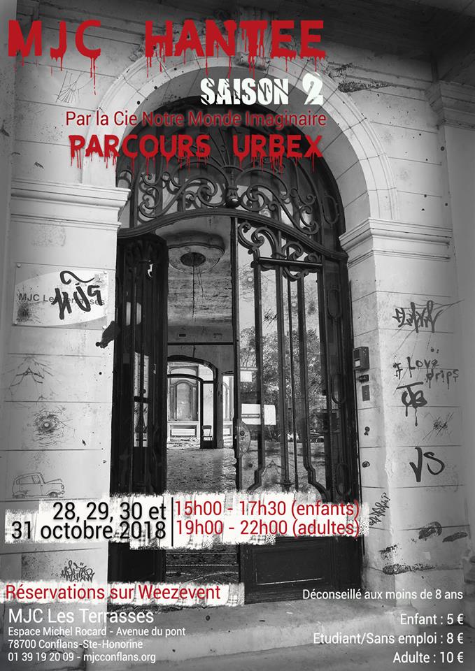 MJC Les Terrasses Avenue du Pont,Conflans St HonorineUn groupe d’amis passionnés d’Urbex, en quête de sensations fortes, se rend dans le manoir de la MJC, abandonné depuis quelques décennies et entouré de légendes funestes. L’expédition tourne vite au cauchemar : la petite équipe se rend compte qu’elle n’est pas seule en ces lieux, elle est cernée et traquée…. Informations complémentaires : - […]