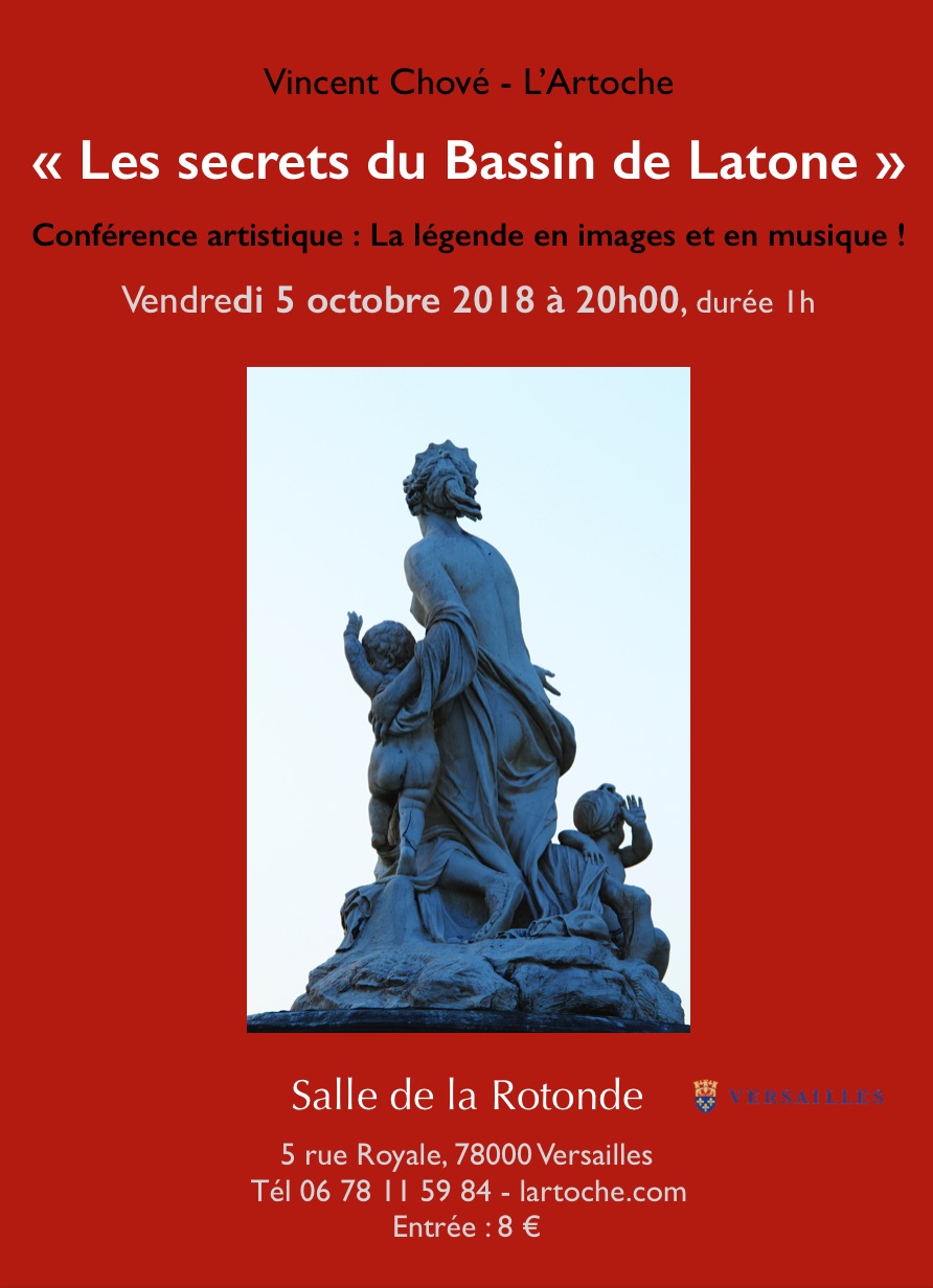 Salle de la Rotonde à Versailles 5 rue Royale,VersaillesPar Vincent Chové, conférencier, musicien, photographe, historien et poète. Une femme, Latone, qui semble appeler au secours, deux jeunes enfants, un garçon et une fille à ses côtés qui ne sont rien moins que le dieu du Soleil et la déesse de la Lune. Mais aussi des créatures mi hommes, mi animaux, autour d’eux, et […]