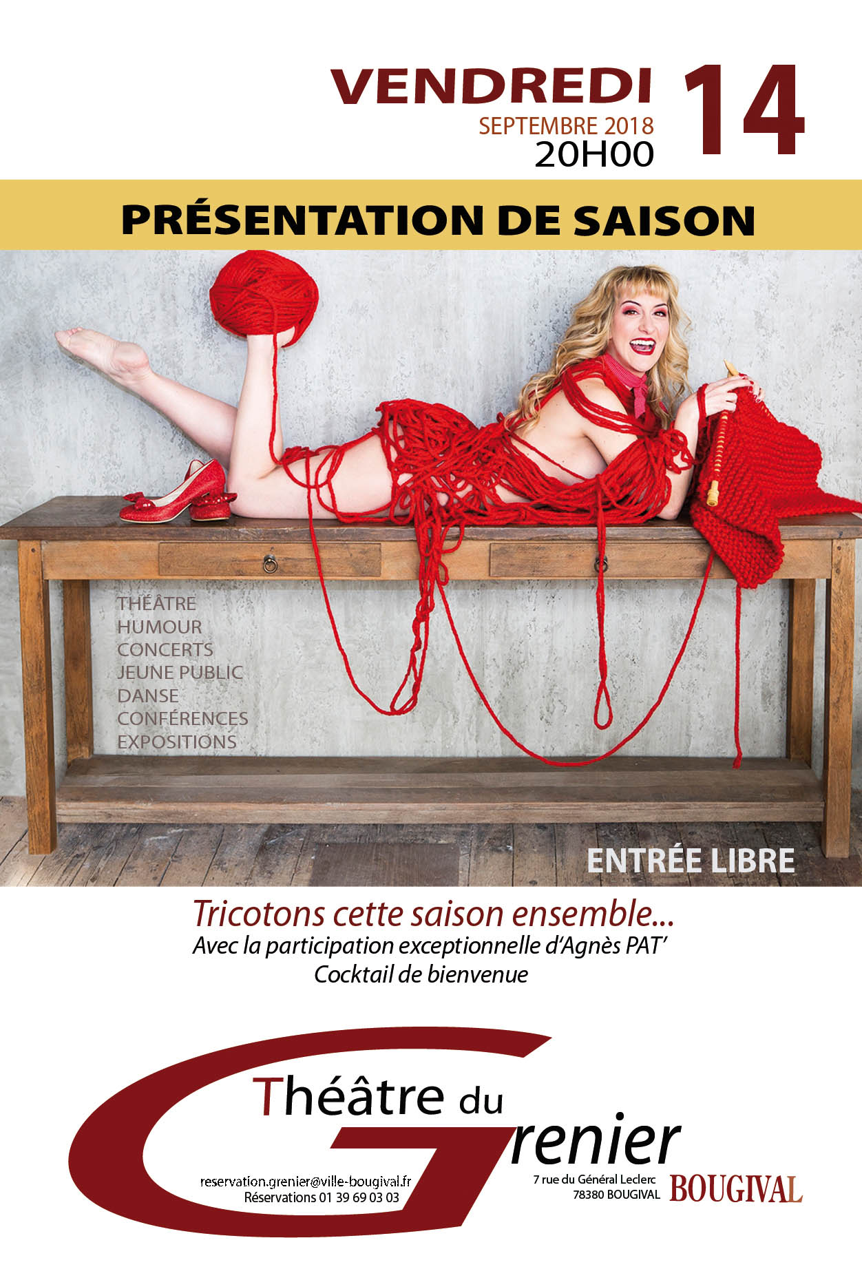 Théâtre du Grenier de Bougival 7 rue du Général Leclerc,BougivalNous vous convions chaleureusement à la présentation de la saison culturelle 2018/2019 Le vendredi 14 septembre à 20h au Théâtre du Grenier de Bougival. Un moment de convivialité et d'échanges à partager avec les artistes et l'équipe du théâtre. Agnès Pat' viendra ponctuer cette présentation avec ses chansons et son humour ravageur! Cocktail de bienvenue Réservation souhaitée à reservation.grenier@ville-bougival.fr ou au 01 […]