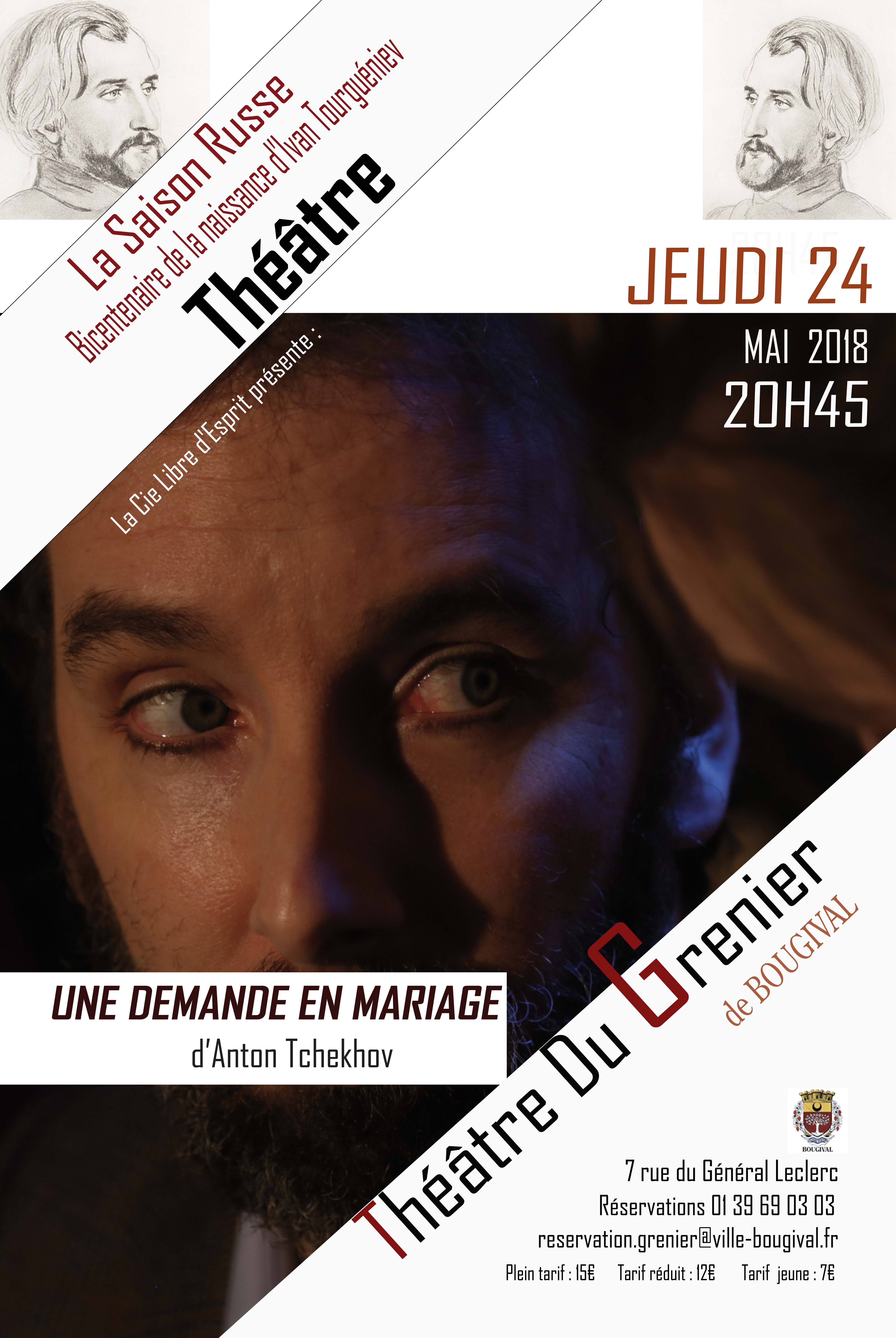 Théâtre du Grenier de Bougival 7 rue du Général Leclerc,BougivalUn homme de trente-cinq ans vient demander en mariage la fille du voisin, et celui-ci s'en réjouit. Tout se présente au mieux, seulement les deux jeunes gens s’engagent dans une discussion d’affaires qui prend des proportions démesurées avec une grande violence. Comment une classique demande en mariage chez des propriétaires terriens de la grande Russie […]