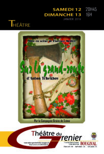 Théâtre du Grenier de Bougival 7 rue du Général Leclerc,BougivalSUR LA GRAND-ROUTE D'Anton Tchekhov Samedi 12 janvier à 20H45 Dimanche 13 janvier à 16H Dans les années 1880, par une nuit d’orage, quelque part dans la steppe d’une province russe, la taverne de Tikhone abrite des personnages aussi hauts en couleurs qu’hétéroclites dont les drames se nouent, se dénouent, se dévoilent ou se devinent […]