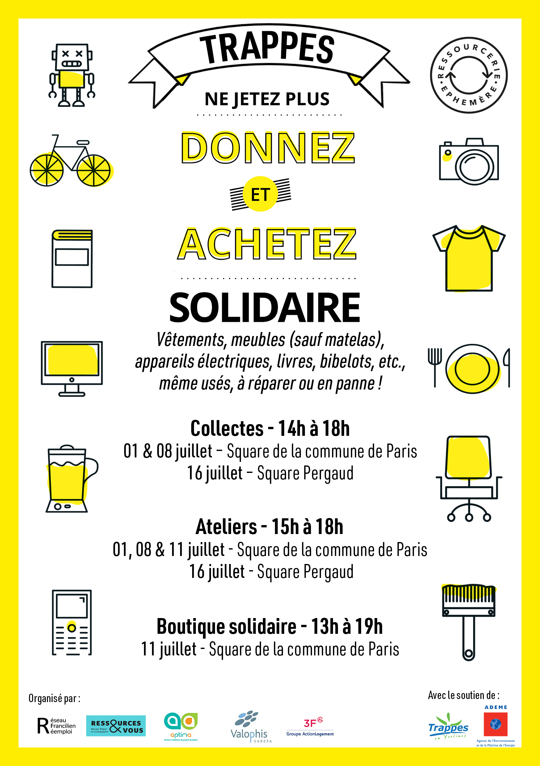 Trappes-en-YvelinesNe jetez plus : donnez et achetez solidaire ! Vêtements, meubles (sauf matelas), appareils électriques, livres, bibelots,... Même usées, à réparer ou en panne ! Collectes - 14h à 18h les 1er et 8 juillet - Square de la commune de Paris 16 juillet - Square Pergaud Ateliers - 15h à 18h les 1er, 8 […]