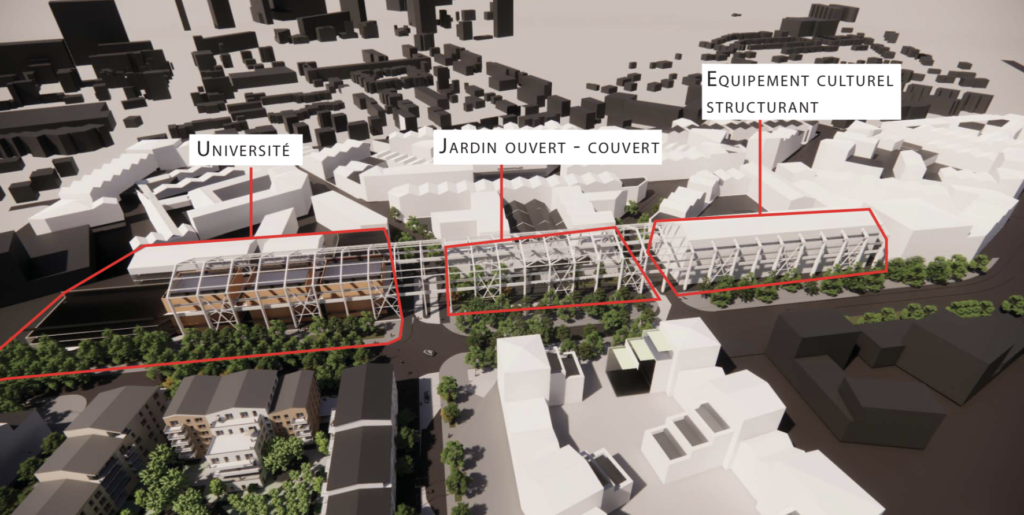 Après la première phase, viendront ensuite différents aménagements car la halle aura trois nouvelles fonctions. Il est prévu d’y implanter un pôle universitaire mais aussi de créer d’un jardin ouvert-couvert au centre et de construire un équipement culturel structurant. La fin du chantier est prévu à l’horizon 2026-2027.