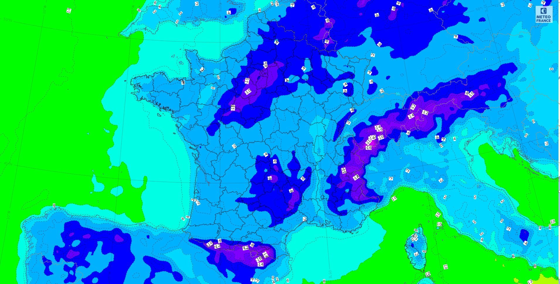 Temps calme et glacé ce jeudi (matin – 5 à – 7 en général et localement -10 à -15). Températures maximales comprise entre 2° et 4° de 11h à 16h, puis températures de nouveau négatives après 16h.