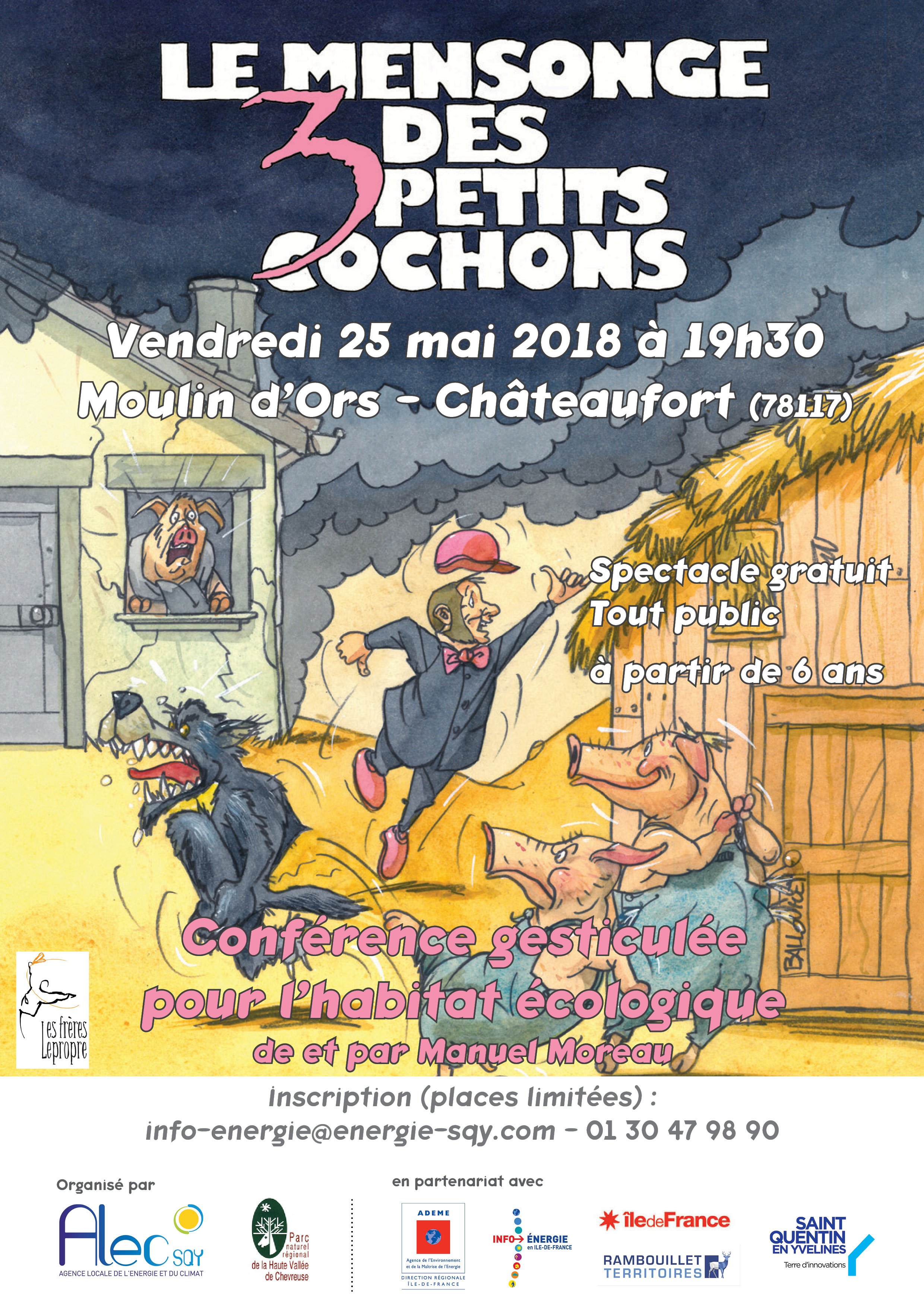 Moulin d'Ors - Chateaufort Rue d'Ors,ChateaufortL’écoconstruction et l’épuisement des ressources expliqués au travers une revisite détonante du célèbre conte des Trois petits cochons… "Le mensonge des Trois petits cochons" est une conférence dite gesticulée où se mêlent infos pratiques, décorticage de greenwashing, jonglerie, clownerie et isolation écologique ! La fameuse histoire "Des 3 petits cochons" est à l’origine du culte […]