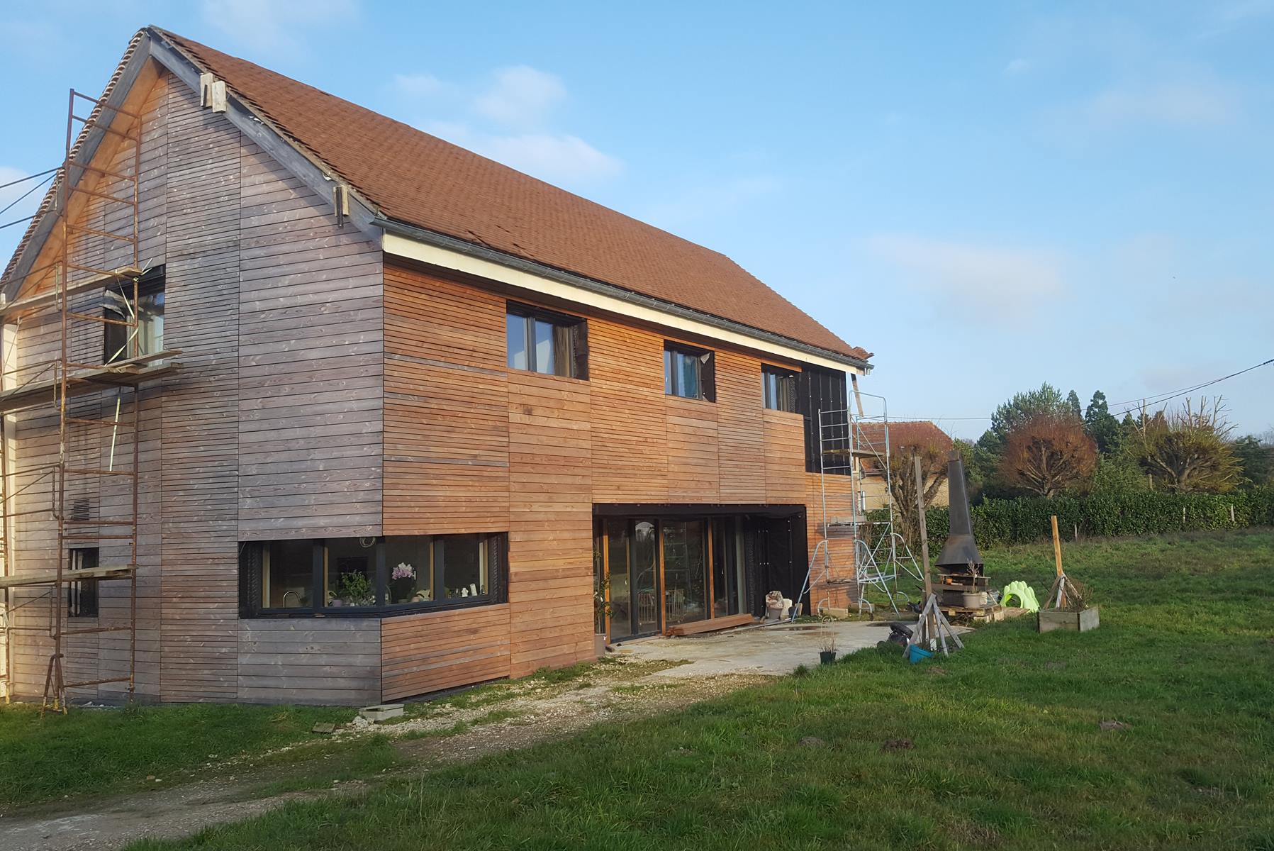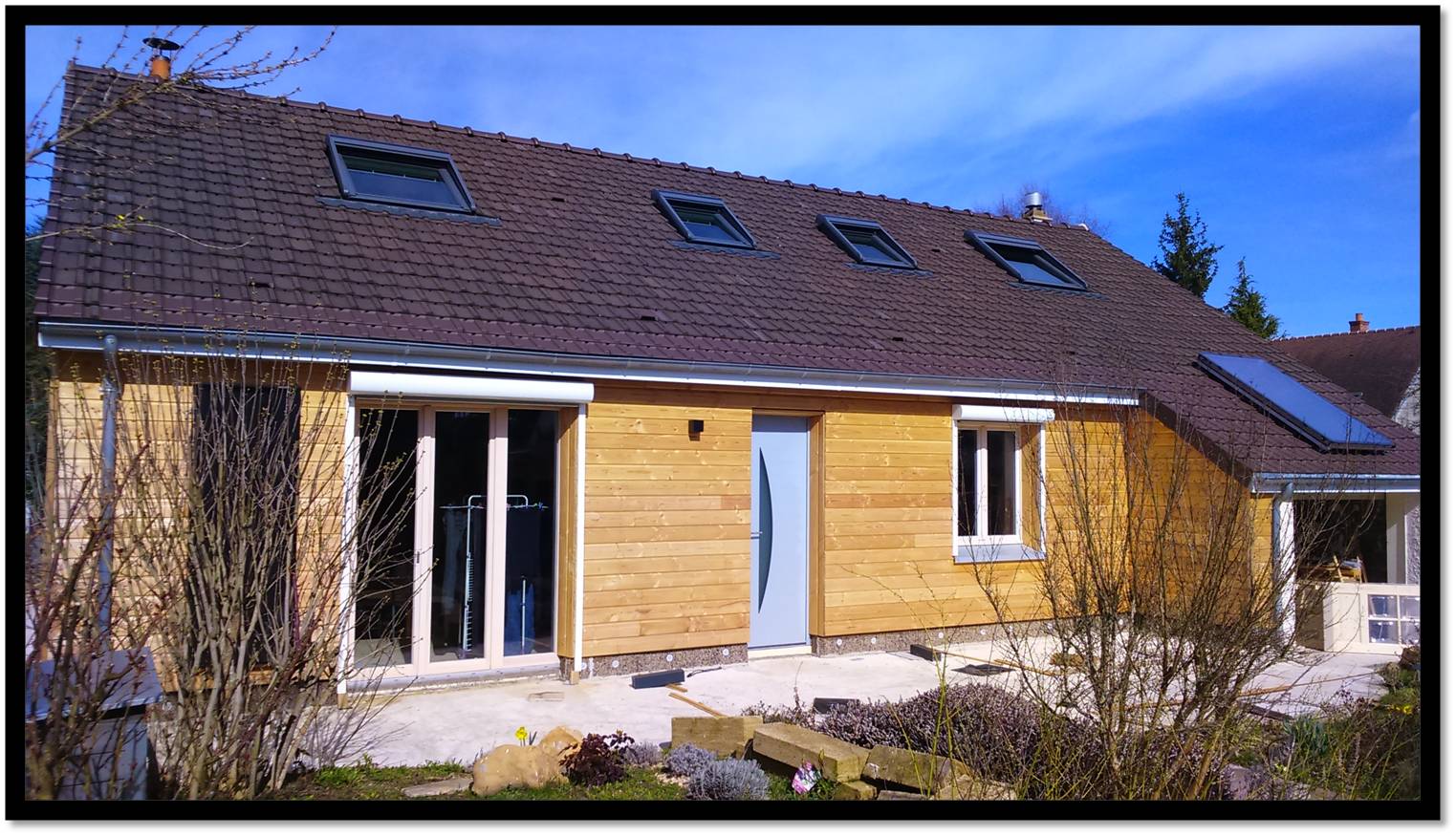 Cette maison construite sur radier est composée de murs en béton de la Lomme et de bardage bois, d'une toiture en poutres Steico. Son plancher bas est isolé avec 60 cm de technopore, ses murs avec 30 cm de polystyrène graphité, et sa toiture avec 40 cm de ouate de cellulose. Les menuiseries sont en […]