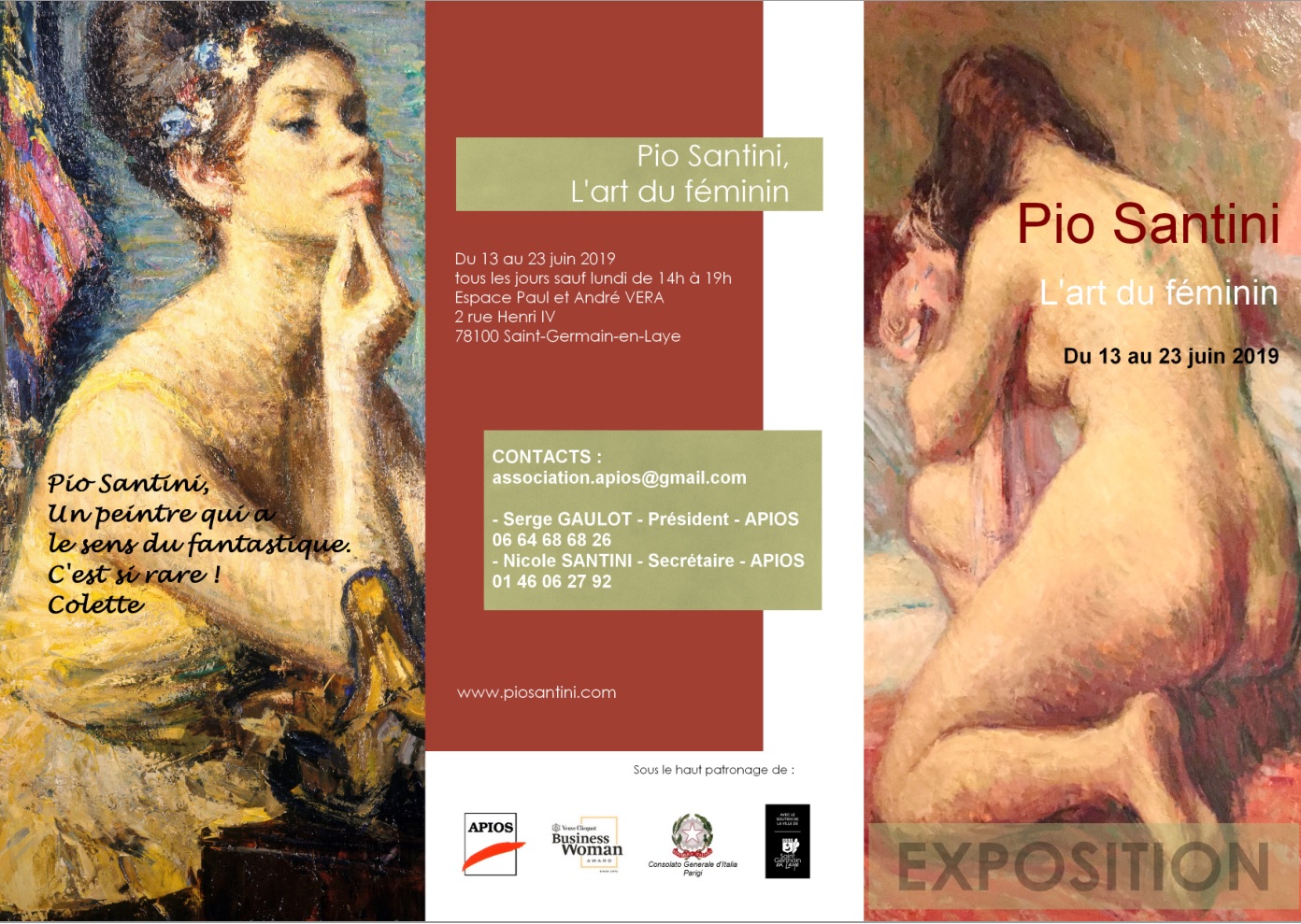 Espace Vera 2 Rue Henri IV,Saint-Germain-en-LayeDu 13 au 23 juin l'Espace Vera expose l'artiste Pio Santini. Des visites commentées et un concert vous sont proposés autour de l’œuvre de Pio Santini. Description La femme inspire Pio Santini et lui offre la possibilité d'exprimer pleinement son art. Que ce soit dans des scènes de famille, la vie quotidienne, le spectacle, l'intimité, […]