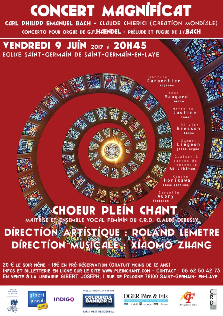 Eglise Saint Germain de Saint-Germain-en-Laye 4 Place Charles de Gaulle,Saint-Germain-en-LayeLe chœur Plein Chant de Saint-Germain-en-Laye y interprétera le Magnificat de Carl Philipp Emanuel Bach ainsi que le Magnificat de Claude Chierici. Cette œuvre contemporaine sera donnée dans ce concert en 1ère création mondiale en présence de son compositeur. Programme détaillé du concert : - Prélude et Fugue en Mi bémol majeur BWV 552 de #Jean_Sébastien_Bach […]