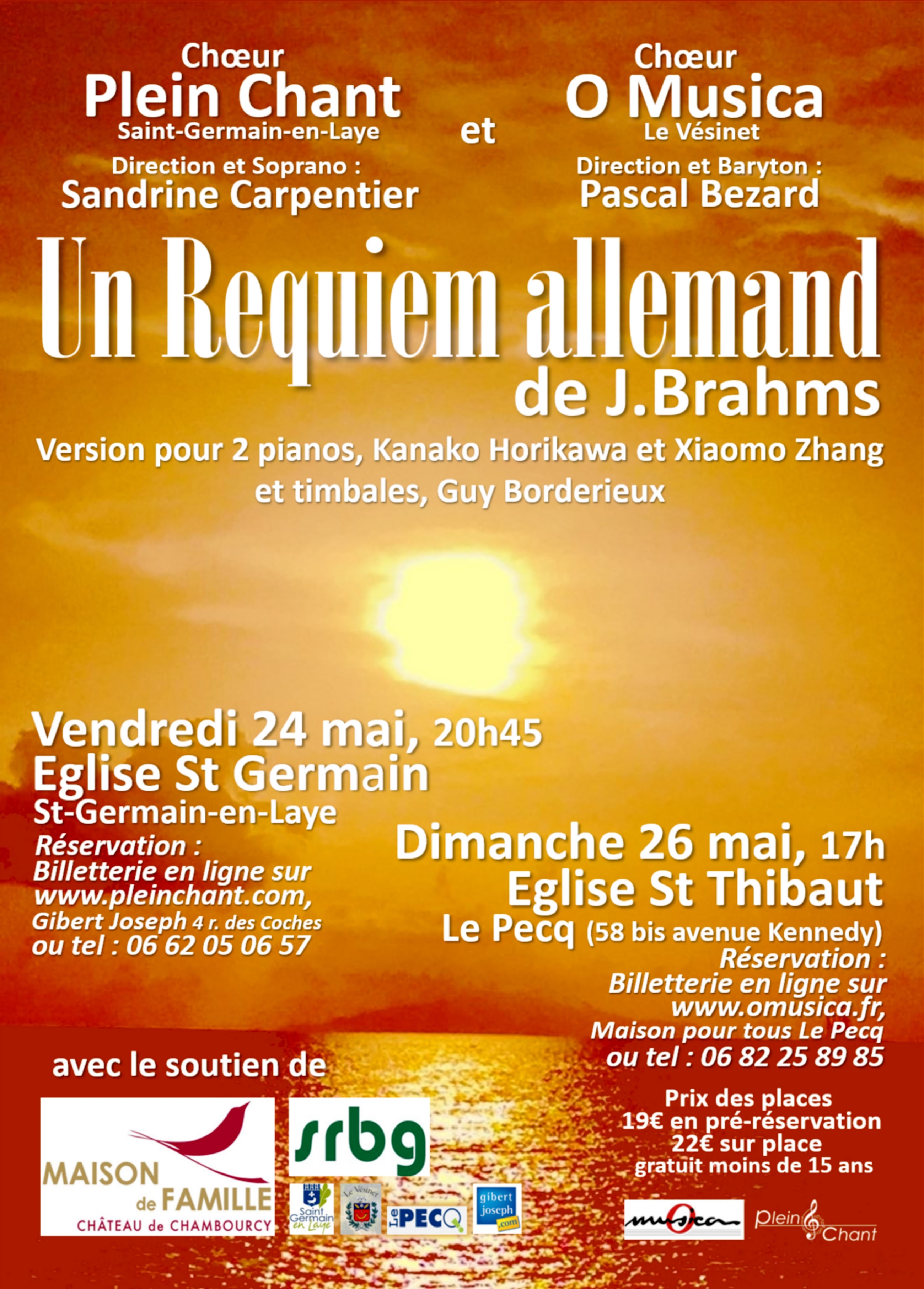 Eglise Saint Germain de Saint-Germain-en-Laye 4 Place Charles de Gaulle,Saint-Germain-en-LayeSous la Direction musicale conjointe de Sandrine Carpentier et de Pascal Bezard, le Chœur Plein Chant de Saint Germain-en-Laye, auquel se joindra le Chœur O Musica du Vésinet, chantera Un Requiem allemand de Johannes Brahms, Les 120 choristes seront accompagnés par Kanako Horikawa et Xiaomo Zhang, aux pianos, et Guy Borderieux aux timbales. Sandrine Carpentier […]