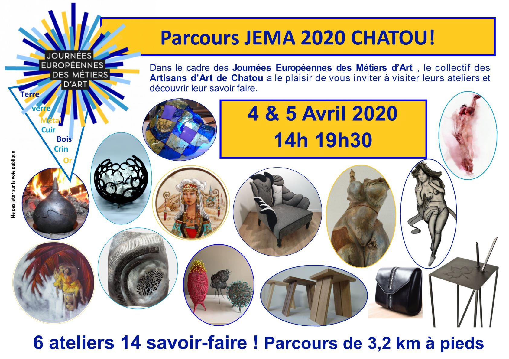 chatou 24 RUE LANTOINE,ChatouDans le cadre des Journées Européennes des métiers d’art 2020 ( JEMA), le collectif des Artisans d’art de Chatou a le plaisir de vous inviter à visiter leurs ateliers . Sur une distance de 3,2 km découvrez 6 ateliers 14 savoir-faire. Notre parcours démarre chez l’atelier Vent d’argile, Véronique L.Tessier, sculpteur céramiste, travail du grès […]