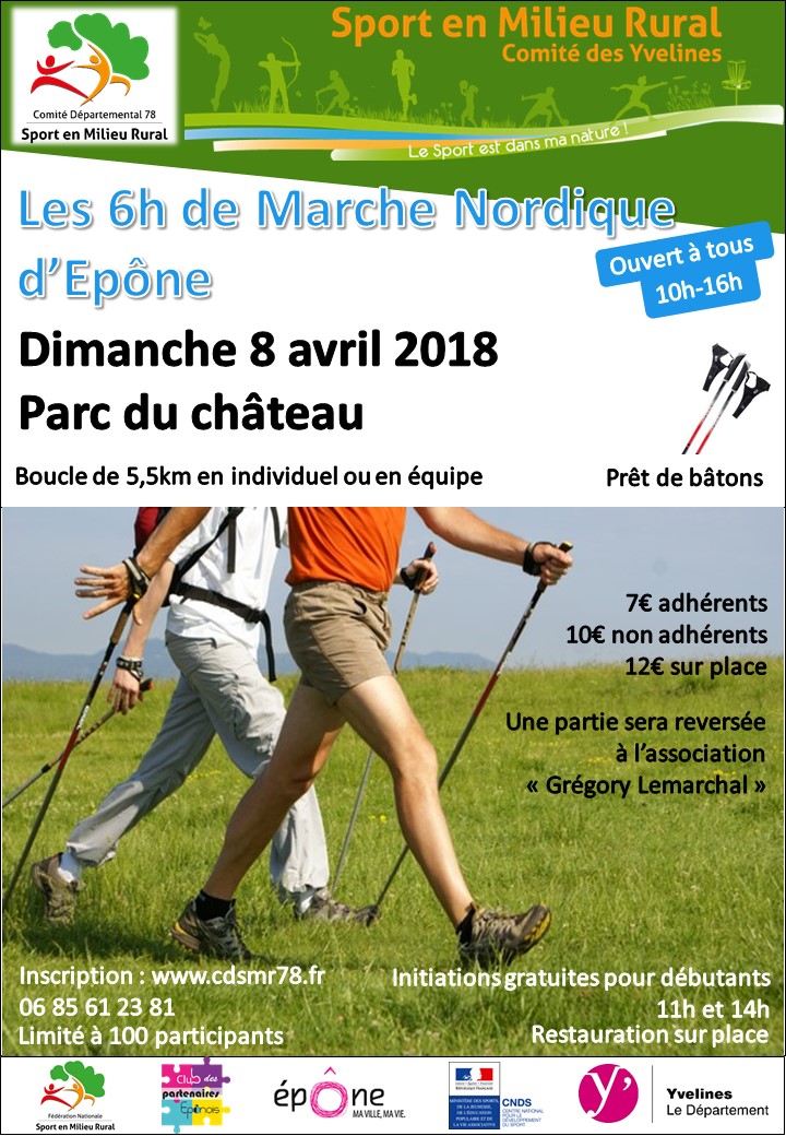 Parc au chateau 9 Rue du Pavé,EponeEn partenariat avec la mairie d'Epône, le Comité Départemental du Sport en Milieu Rural des Yvelines et le Club des Partenaires Epônois organisent "Les 6h de Marche Nordique d'Epône" dimanche 8 avril 2018. Il s'agit de réaliser une boucle de 5,5kms en individuel ou en équipe (4 maximum) au départ du parc au château d'Epône. Les équipes […]