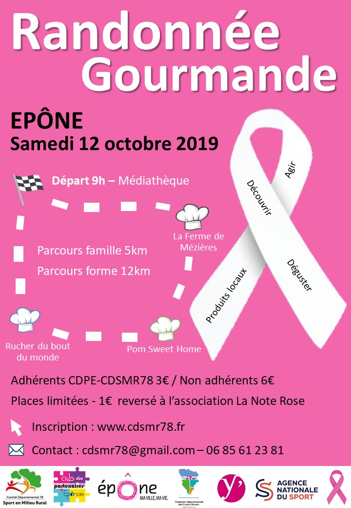 Epône Parc au château,EpôneDans le cadre d'Octobre Rose, leComité Départemental du Sport en Milieu Rural des Yvelines (CDSMR78) organise, en collaboration avec le Club des Partenaires Epônois une Randonnée Gourmande samedi 12 octobre. De quoi s'agit-il ? Un circuit de 5 ou 12 km avec des arrêts dégustation sur des stands ou chez des producteurs/artisans locaux. Vous aurez […]