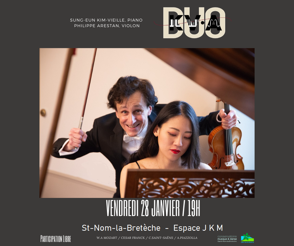 Espace JKM 10 Rue Arthur Rimbaud,Saint-Nom-la-BretêcheConcert de Noël du Conservatoire de St-Nom-la-Bretèche à l'Espace JKM. Duo KV.A : Sung-Eun KIM-VIEILLE, piano et Philippe ARESTAN, violon. Œuvres de Mozart, Franck, Saint-Saëns, Piazzolla.