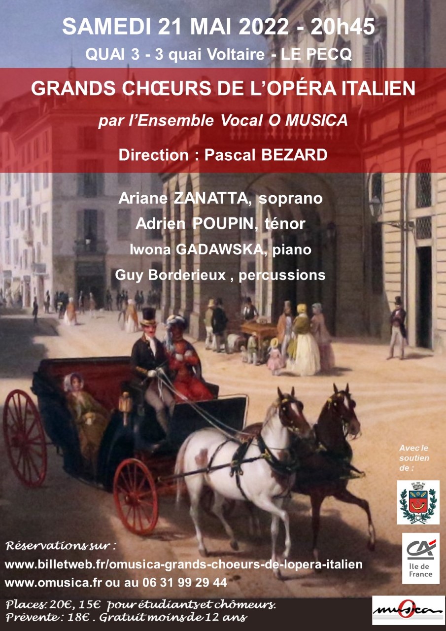 Le Quai 3 3 Quai Voltaire,Le PecqAprès deux ans d'attente, l'ensemble vocal O Musica du Vésinet donnera un concert dédié aux grands chœurs de l'opéra italien le samedi 21 mai à 20h45 au Quai 3 au Pecq (3 quai Voltaire). En plus des chœurs des opéras les plus célèbres (Turandot, Luccia di Lammermor, Don Pasquale, Norma, Macbeth, Nabucco, Le Trouvère, Traviata, […]