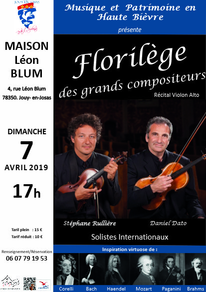 Maison Léon Blum 4 rue Léon Blum,Jouy-en-JosasLe programme de ce récital en duo violon-alto est composé d'oeuvres emblématiques de grands compositeurs qui sont avant tout et pour la plupart de grands interprètes. Nous évoquerons intentionnellement des oeuvres de compositeurs nés avant, pendant et après la période classique. A. CORELLI (1653-1713) La Follia J.S. BACH (1685-1750) Inventions Extraits de Suites et Sonates […]
