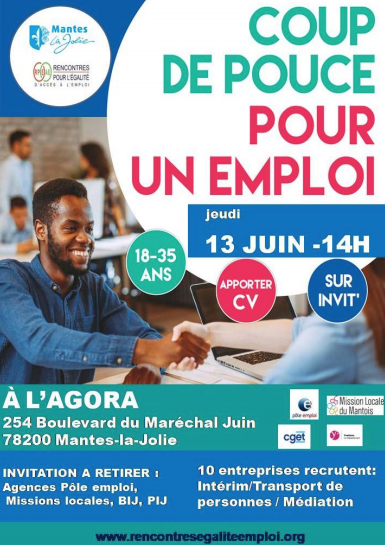 L'agora 254 Bd du Maréchal Juin,Mantes-la-JolieL'association Rencontres pour l'Egalité d'Accès à l'Emploi s’associe à la ville de Mantes-la-Jolie pour organiser un job-dating « Coup de Pouce pour un Emploi », le jeudi 13 juin 2019 à 14h00 précises à l’AGORA 254 Bd du Maréchal Juin 78200 Mantes-la-Jolie. Ce job-dating, destiné au 18-35 ans, permet de bénéficier d’entretiens directs avec des […]