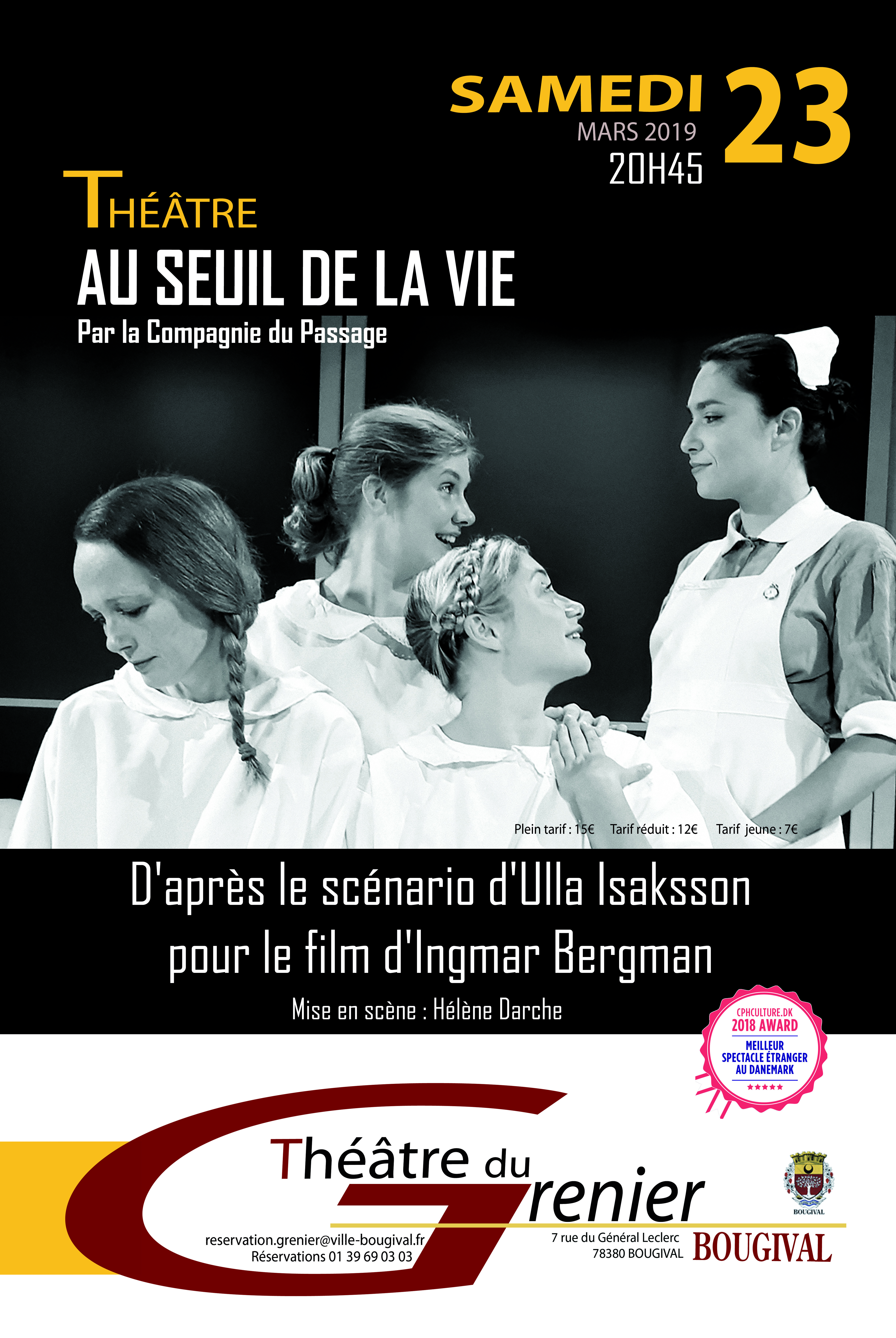 Théâtre du Grenier de Bougival 7 rue du Général Leclerc,BougivalPièce de théâtre, d'après le scénario d'Ulla Isaksson, pour le film d'ingmar Bergman. Compagnie du passage. Mise en scène : Hélène Darche. Coup de cœur du festival Off Avignon 2017 de l’équipe bibliothèque nationale de France Meilleur spectacle étranger au Danemark Un huis clos dans une éternité où les êtres se révèlent face à la […]