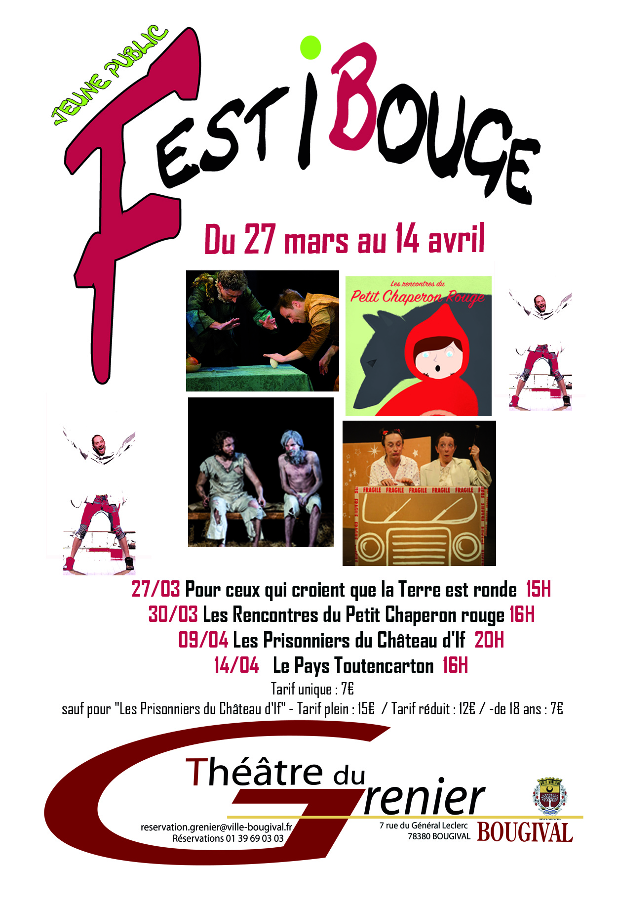 Théâtre du Grenier de Bougival 7 rue du Général Leclerc,BougivalPour cette 3eme édition, le Festival jeune Public, "Festi'Bouge" propose du théâtre pour les enfants et les adolescents dans un esprit dynamique et participatif. L'action artistique et culturelle auprès des enfants et des jeunes est une priorité. Ce festival sensibilisera les plus jeunes au spectacle vivant et les rendra acteurs de cet évènement. Un jury […]
