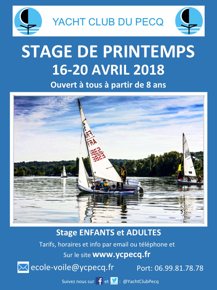 Yacht Club du Pecq 1 bd de la Libération,Le PecqNous avons le plaisir de vous informer de l’organisation d’un stage de voile de Printemps qui se déroulera pendant les vacances scolaires du Lundi 16 au Vendredi 20 Avril 2018 au Yacht Club du Pecq pour Adultes et Enfants de plus de 8 ans. De plus amples informations sont fournies sur le site du Yacht […]