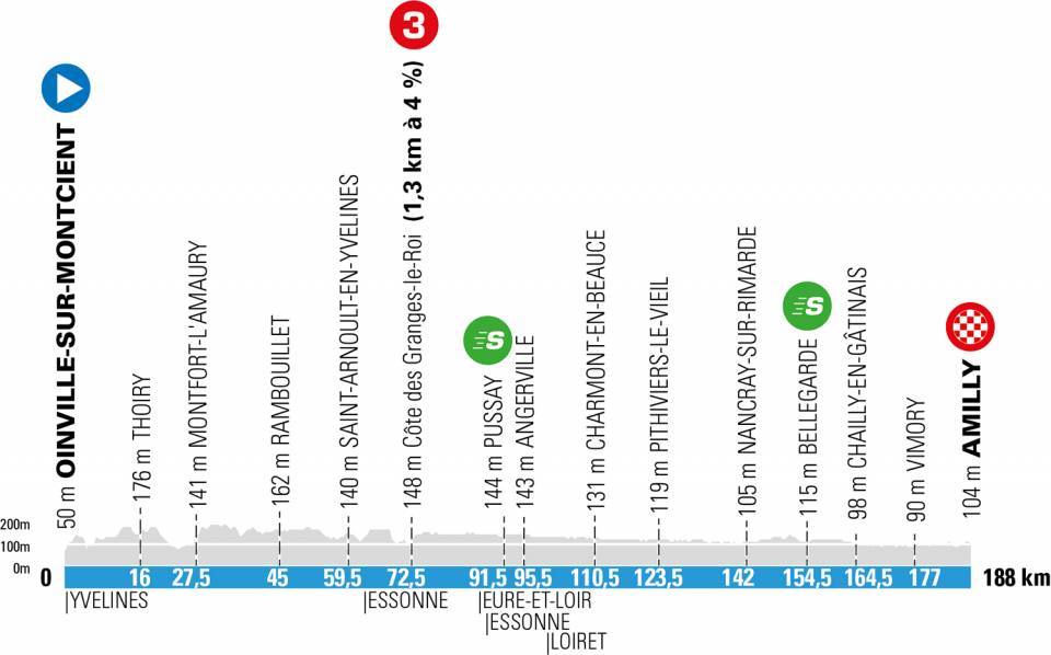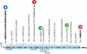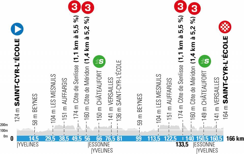 La première étape débutera à 12h55 au départ de Saint-Cyr-l’Ecole. Les coureurs prendront ensuite la direction de Villepreux et Beynes avant de redescendre vers la vallée de Chevreuse par Auffargis et Saint-Rémy-lès-Chevreuse. Les athlètes rejoindront ensuite le site de départ et d’arrivée par une boucle passant pas Magny-les-Hameaux, Châteaufort et Versailles. Elle sera utilisée deux fois avant une arrivée dans le centre de Saint-Cyr. Le premier passage est prévu entre 13h et 14h, le second entre 15h et 16h.