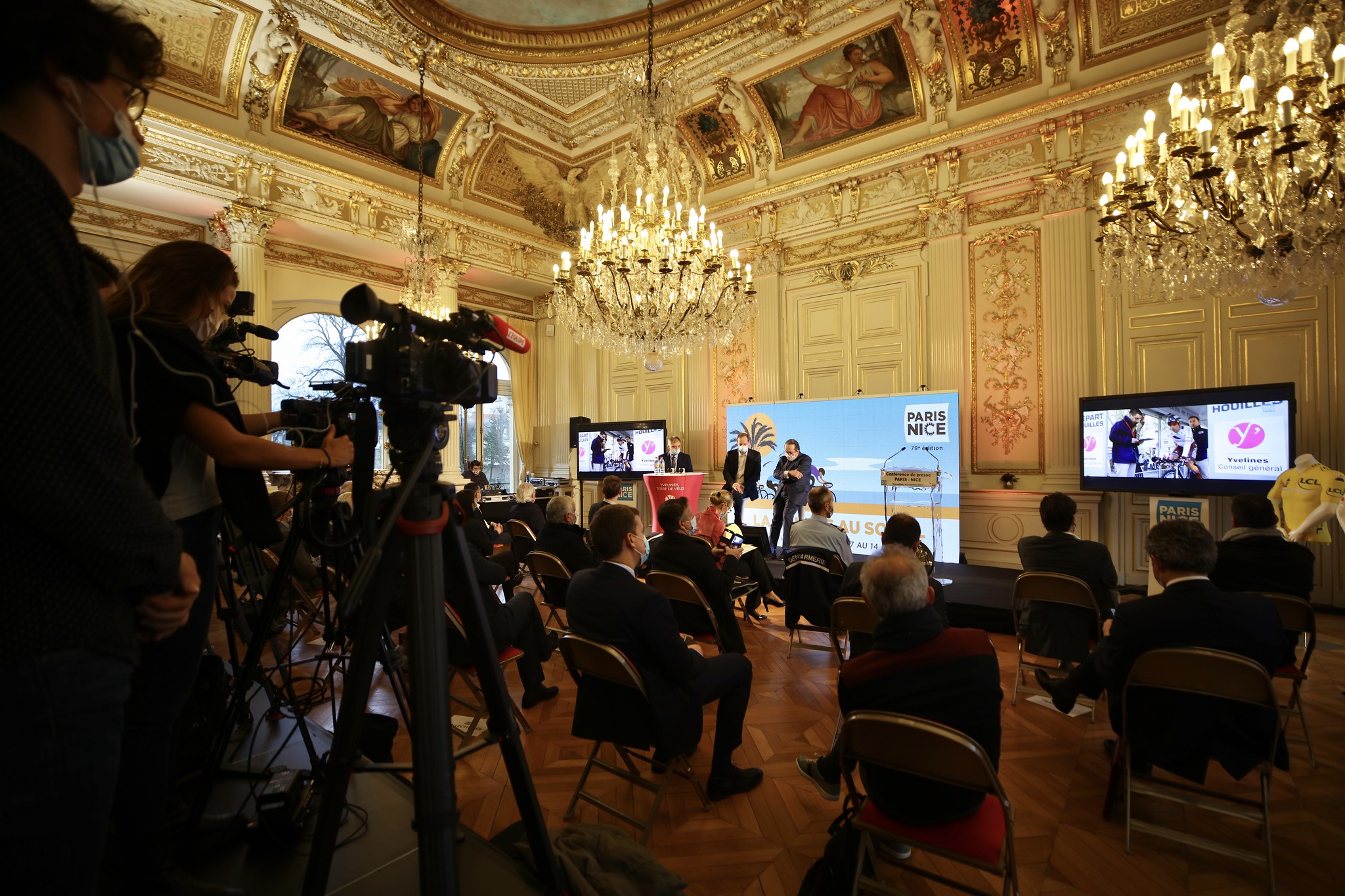 Olivier de la Faire, Pierre Bédier, Sonia Brau, Stéphane Jeanne, élus Yvelinois et Christian Prudhomme, Directeur du Tour de France et des épreuves cyclistes d’A.S.O, présentent le parcours de la 79e édition du Paris-Nice, qui s’élancera une nouvelle fois en 2021 des Yvelines.