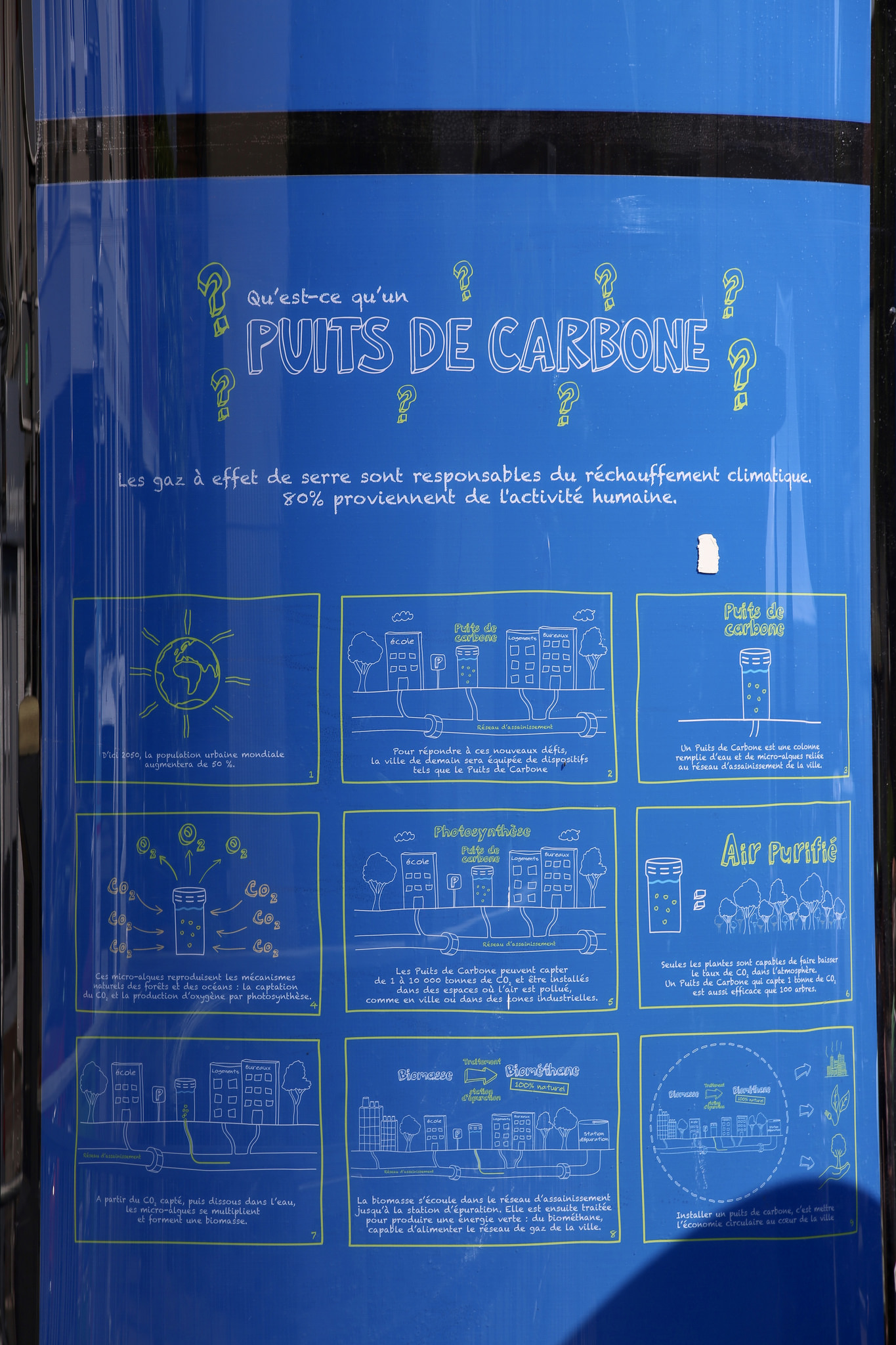 Le quartier de la gare RER de Poissy se pare d’une grande colonne bleue, haute de plus de deux mètres. Ce grand cylindre est un puits de carbone qui reproduit le mécanisme naturel des forêts en absorbant les molécules de photosynthèse.