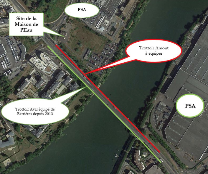 L’ouvrage de franchissement de la Seine par la RD 190 (Pont de Poissy) reliant les communes de Carrières-sous-Poissy et Poissy est emprunté chaque jour par de nombreux piétons désireux de se rendre à la Gare RER, des groupes scolaires se rendant à la Maison de l’Eau à Carrières-sous-Poissy ainsi que par les collaborateurs de PSA dont l’implantation des sites de production est localisée sur les deux berges de la Seine.