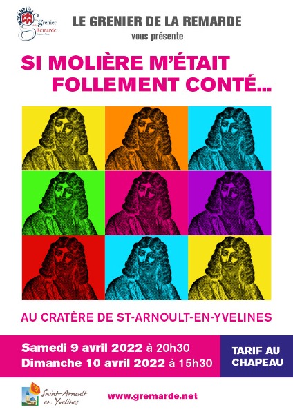 Un spectacle vivant imaginé et créé par la troupe du Grenier de la Rémarde qui fête ses 40 ans et célèbre les 400 ans de Molière autour de 5 extraits de pièces. Une épopée romanesque au cours de laquelle 5 extraits de ses pièces vont prendre vie à la scène à mesure qu’elles naissent dans son esprit. Rendez-vous à Saint-Arnoult-en-Yvelines pour admirer le spectacle !