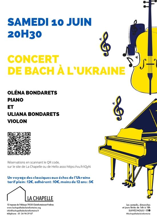 La Chapelle a le plaisir de vous convier au concert du samedi 10 juin à 20h30 où vous pourrez découvrir deux magnifiques solistes ukrainiennes : Oléna Bondarets au piano et Uliana Bondarets au violon. Ensemble, elles forment un duo piano-violon et vous offriront un programme varié qui ne manquera pas de vous enchanter.