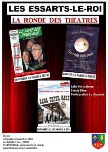 • Dimanche 17 mars 2019, cette même salle polyvalente accueille « Sans crier gare », une pièce donnant la parole à différents personnages dans un hall de gare. Une mise en scène collégiale, déconseillée aux moins de 10 ans.