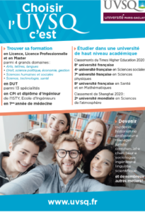 • Comme chaque année l’UVSQ ouvre ses portes aux futurs étudiantes et étudiants ainsi qu’à leurs parents. Tous sont invités à découvrir les formations disponibles après le Bac : licences, DUT, licences professionnelles, CPI, diplôme en Médecine, diplôme d’ingénieur. Les différents campus proposeront des rencontres avec des enseignants et des étudiants afin d’échanger autour du projet professionnel de chacun. Ce week-end le rendez-vous est donné à l’ISTY, école d’ingénieurs, à Mantes-la-Ville de 10h à 17h !