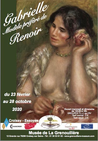 • Poursuivant son hommage à Pierre-Auguste Renoir initié en 2019 pour le centenaire de la mort de l’artiste, le Musée de la Grenouillère vous invite à un voyage de charme avec l’exposition « Gabrielle modèle préféré de Renoir». Cette exposition rassemble des œuvres issues de collections particulières et évoque la destinée hors du commun de Gabrielle Renard, fille de la campagne champenoise qui, de Paris à Grasse et jusqu’aux Etats-Unis, sera tour à tour employée de maison, nourrice, muse et figure féminine incontournable de deux artistes majeurs du 20e siècle : le peintre Auguste Renoir et le cinéaste Jean Renoir. À ne pas manquer !