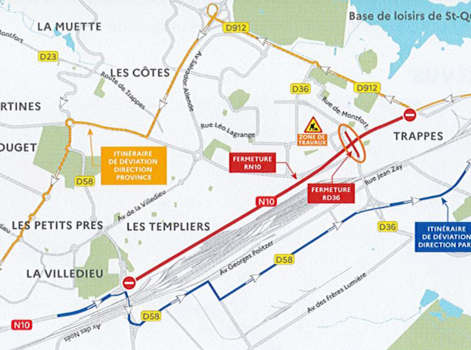 Afin de faciliter les travaux de requalification de la RN10 à Trappes, la RN10 et la RD36 seront fermées à la circulation du 17 au 19 août.