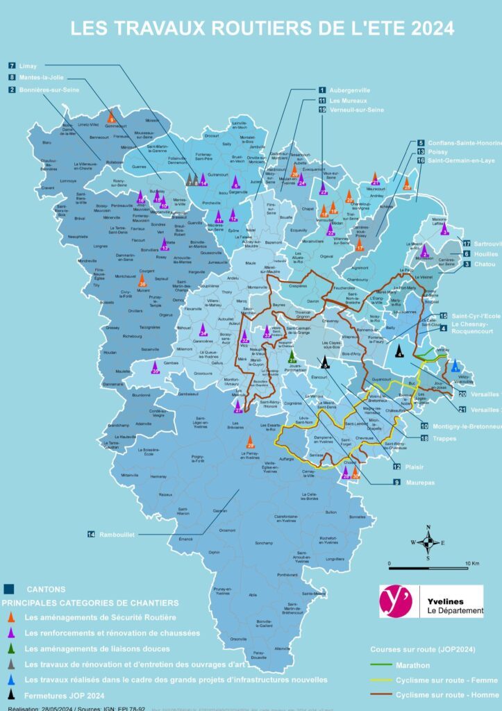 Pas de chantiers d’envergure cet été sur les routes départementales en raison des Jeux Olympiques. Les travaux, qui concernent une trentaine de communes, se situent essentiellement dans le nord des Yvelines, une zone qui n’est pas impactée par les Jeux Olympiques.