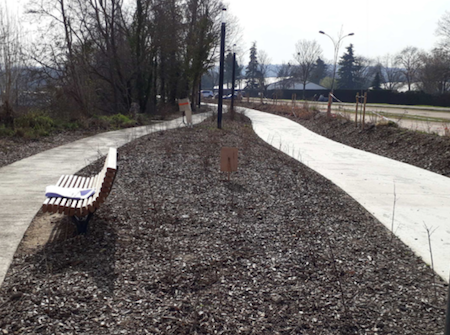 Au bord de l’eau, le chantier devait se fondre dans le paysage. Interdiction donc de bétonner ces bords de Seine qui doivent être un havre de paix pour les promeneurs et les cyclistes. Ainsi, de chaque côté de la voie, un espace de végétation est prévu. Entre la route et la voie, un talus d’une largeur de 2,75m est installé. Assorti d’un fossé, il empêche le franchissement intempestif. Cette zone sera ainsi délimitée par des buissons et de petits arbres. De l’autre côté, une perméabilité végétale entre la Seine et la voie est possible grâce à de grands arbres.