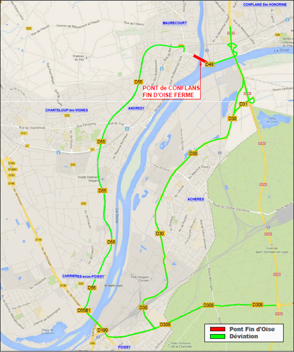 C’est ainsi, qu’à Conflans-Sainte-Honorine et durant tout l’été, le pont de franchissement de l’Oise situé entre Andrésy et Conflans-Sainte-Honorine (Route Départementale 48) doit faire l’objet d’une opération importante d’entretien du tablier et sera fermé totalement à la circulation entre le 15 juillet et le 26 Aout 2019.