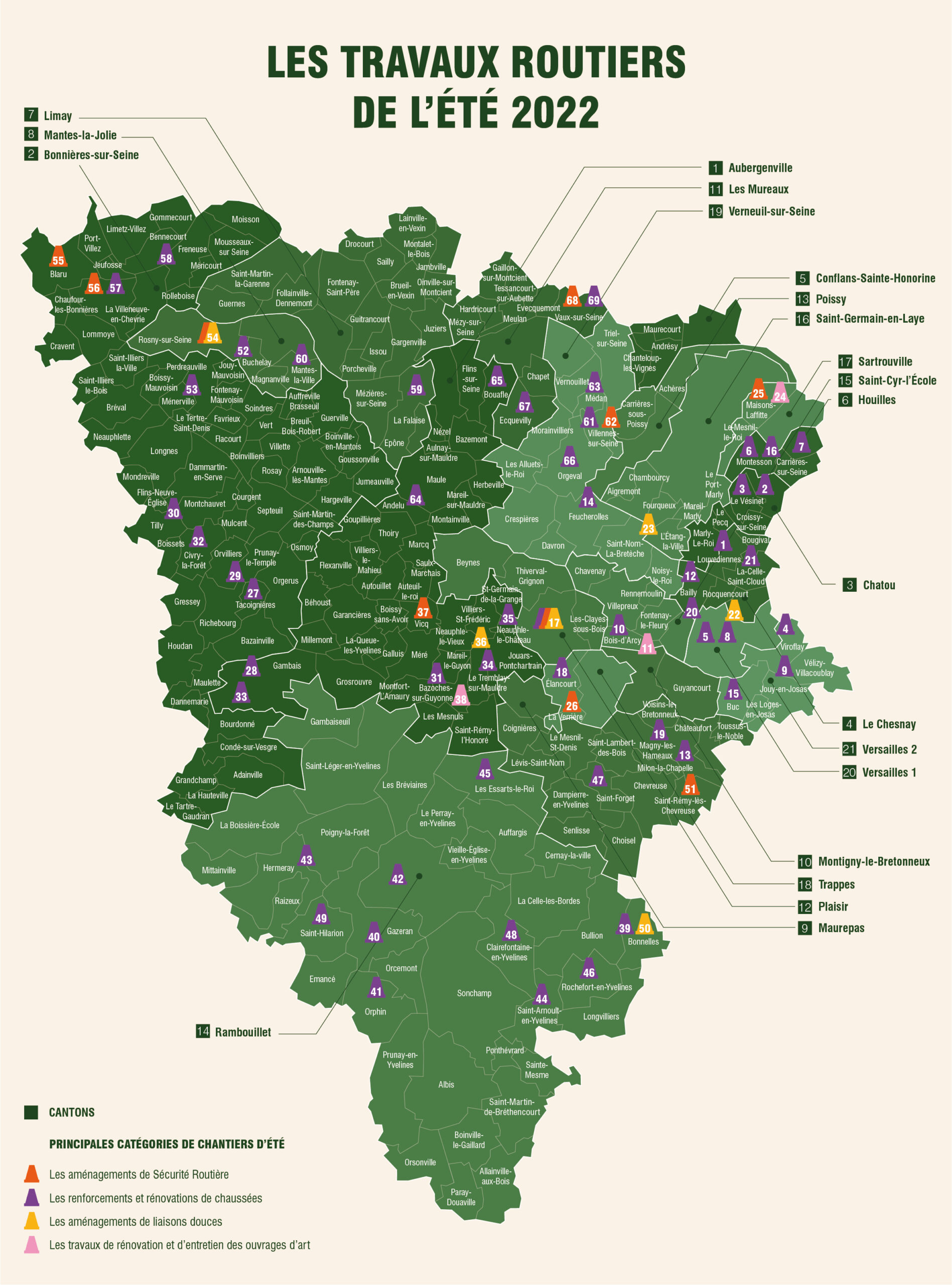 Au programme 69 chantiers sont prévus dans près de 70 communes yvelinoises pour les travaux d’été. « Je crois que nous avons bien réparti ces travaux sur tous les cantons », ajoute l’élu. Il faut dire que le réseau routier des Yvelines est vaste. Ce sont au total 1 600km de routes qui nécessitent un entretien et une surveillance particulière.