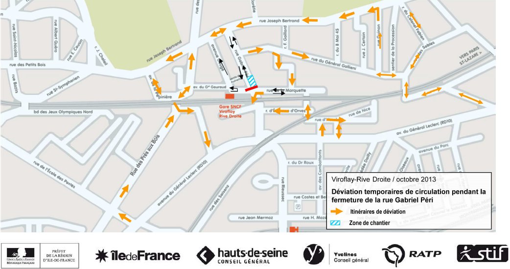 La rue Gabriel-Péri à Viroflay sera fermée à la circulation ce mercredi 2 octobre jusqu’à jeudi 3 octobre à 7h30 pour réaliser des travaux sur le pont provisoire dans le cadre des travaux de construction de la future station souterraine de Viroflay-Rive droite.
