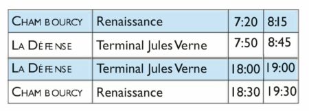 Plusieurs navettes permettent déjà de relier Mantes-la-Jolie, Les Mureaux et Orgeval à La Défense, désormais c’est également possible à partir de Chambourcy. Ile-de-France Mobilités met en place dès lundi 7 janvier 2019 une navette entre Chambourcy et la Défense. Vous ferez le voyage en 30 minutes via l’A14. Ce service est proposé 4 fois par jour : deux passages le matin et deux autres le soir, selon les horaires de bureau.