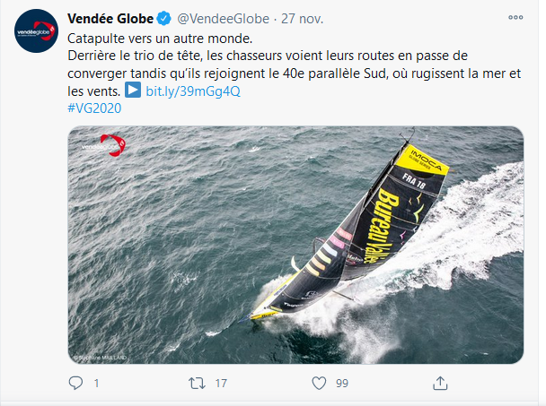 Au dernier pointage (jeudi 3 décembre), il est remonté à la 2e place, le classement ayant été bouleversé par le sauvetage de Kevin Escoffier par Jean Le Cam.
